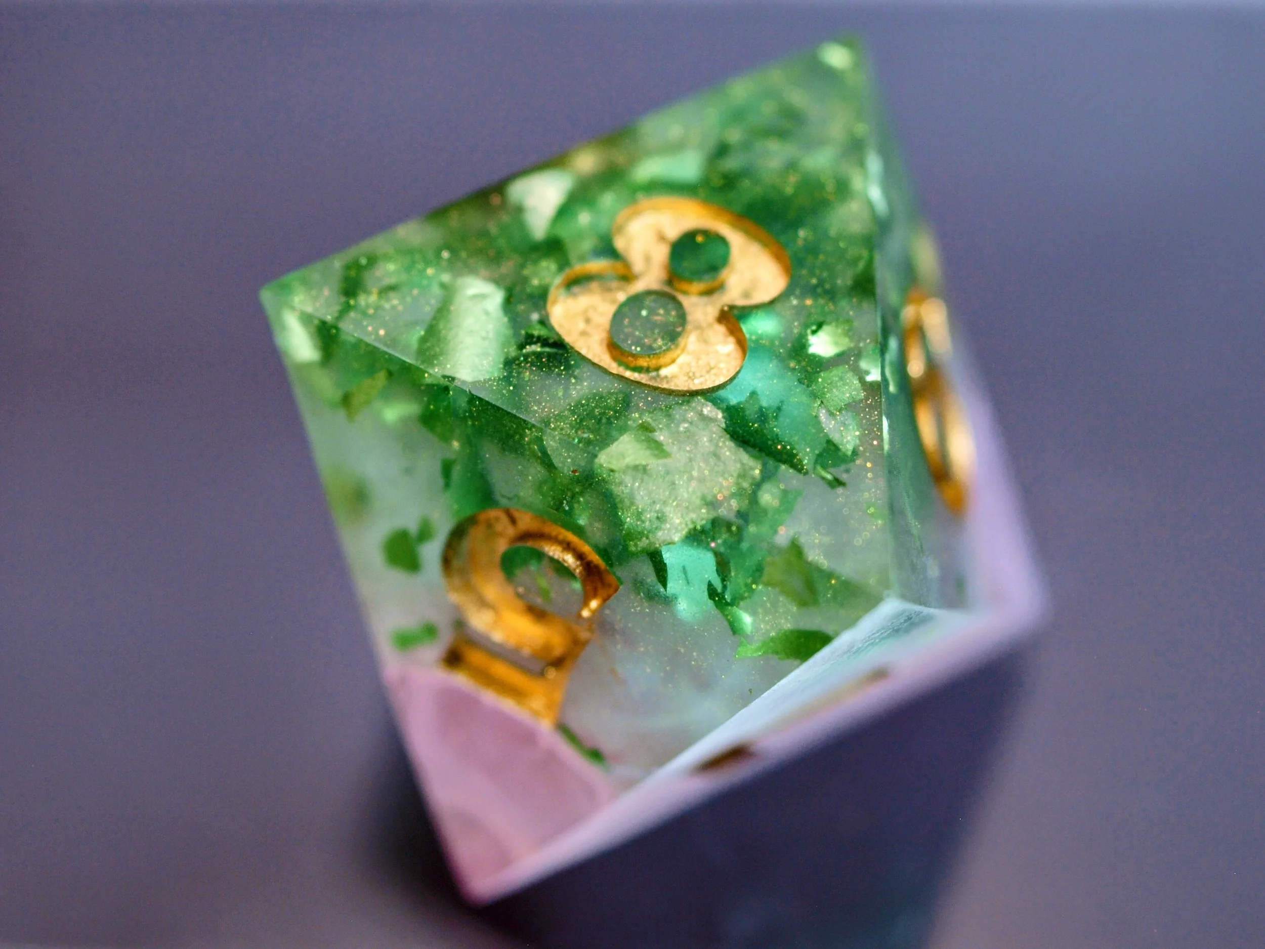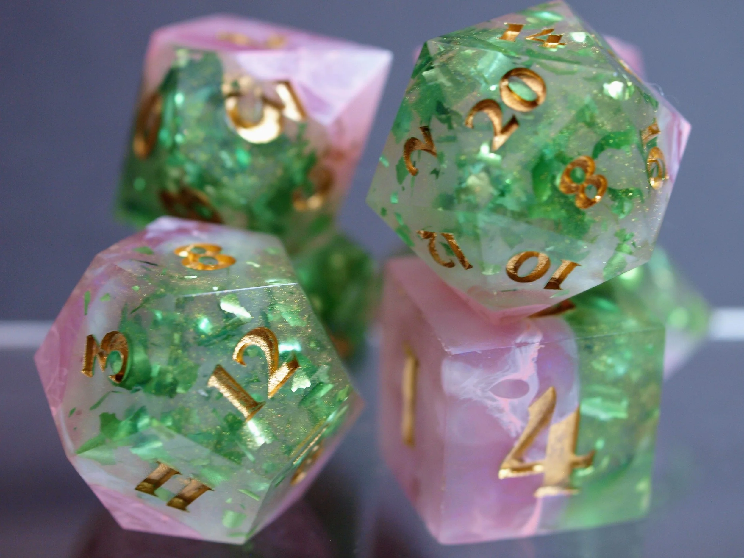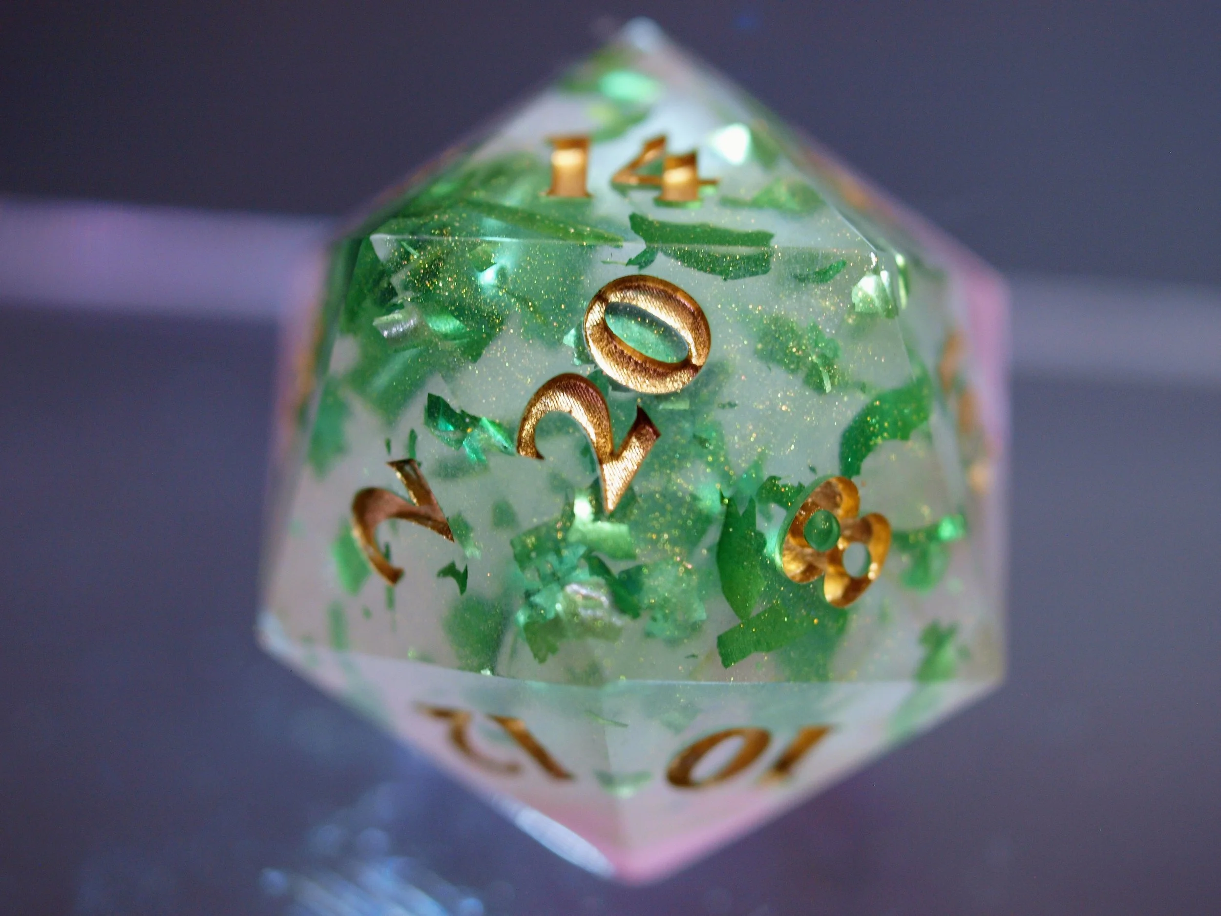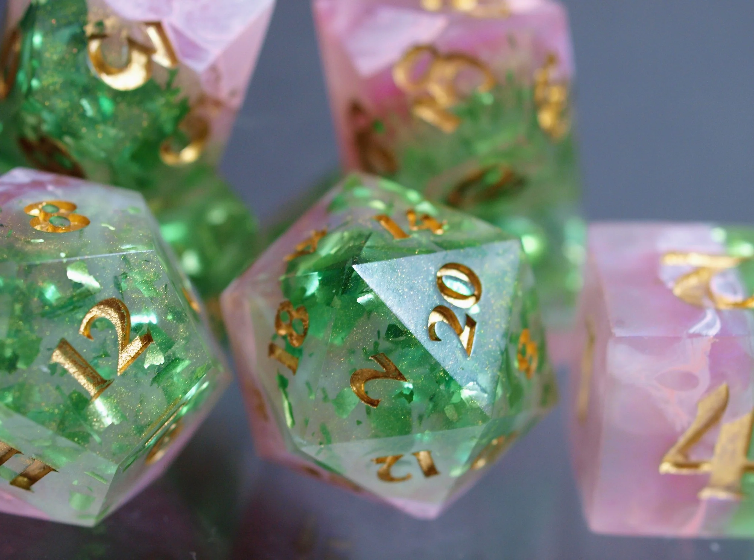 A dice set in a discontinued style, these deeply green and gold dice are a classic any day and will never fade.