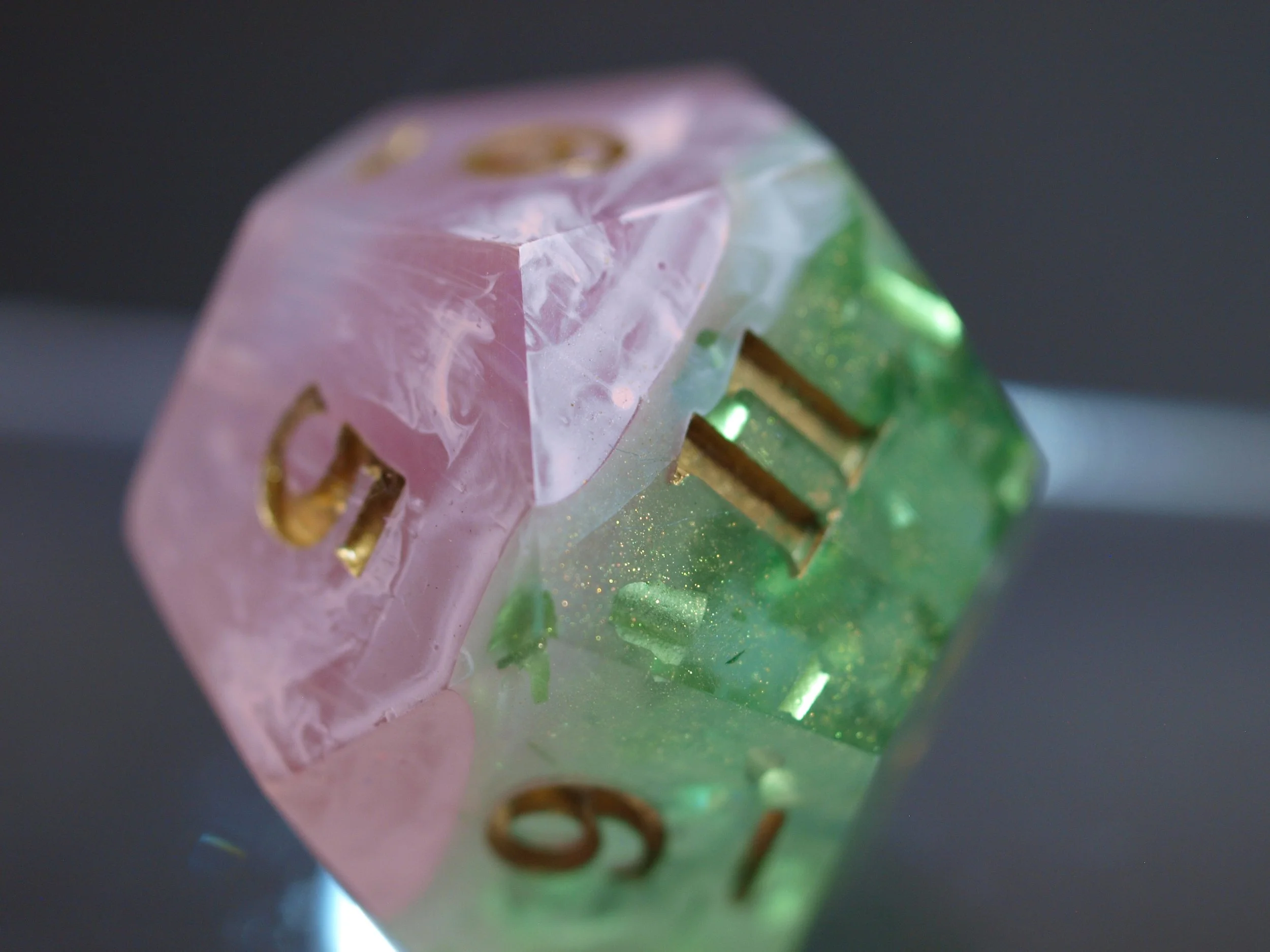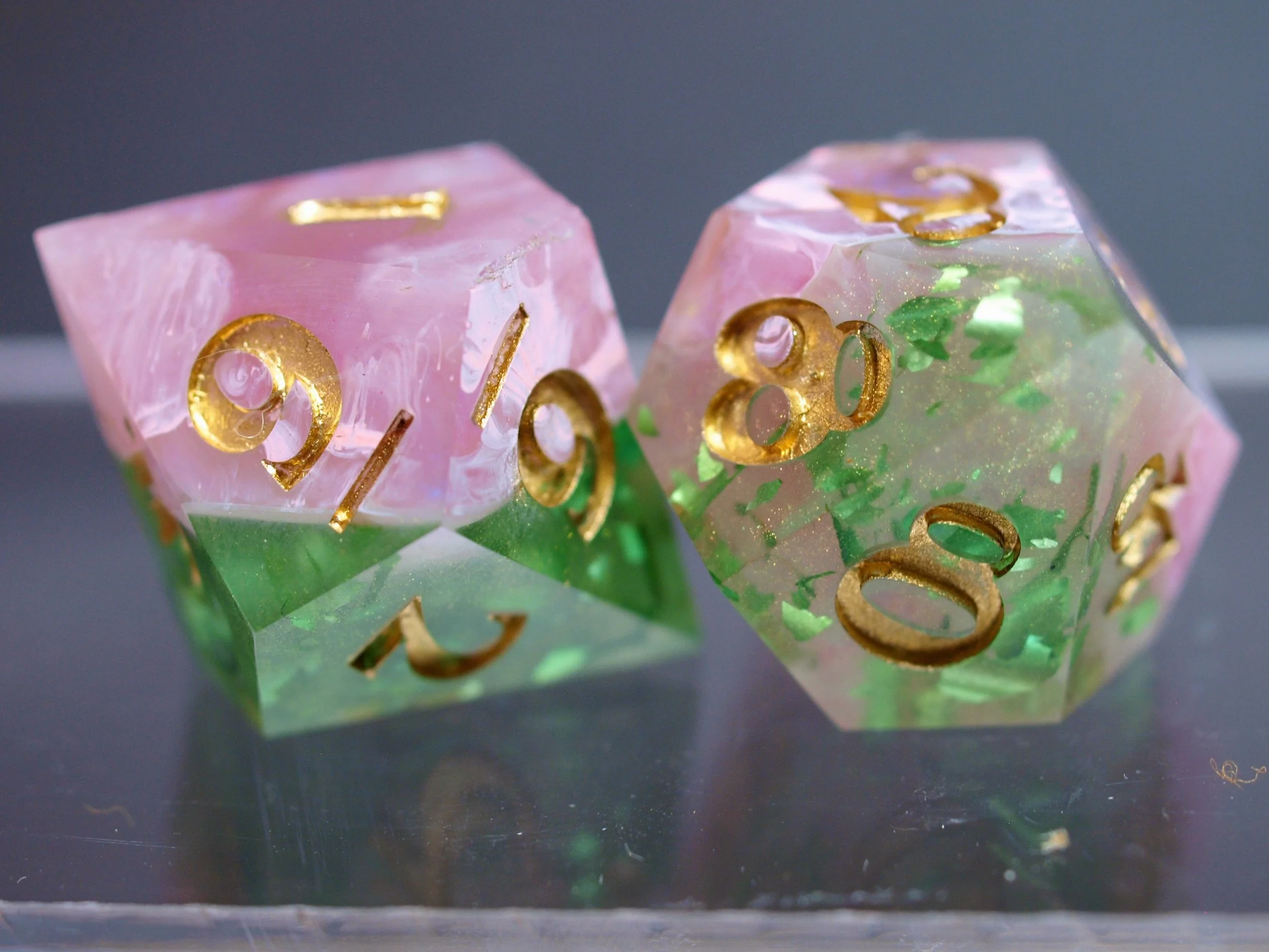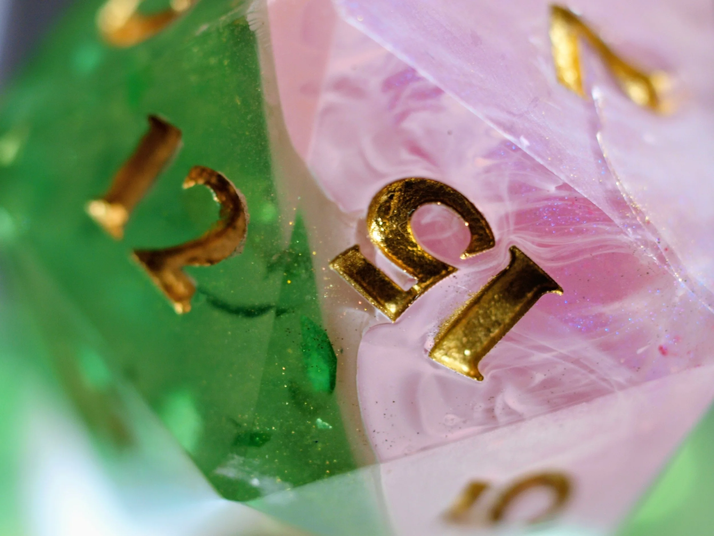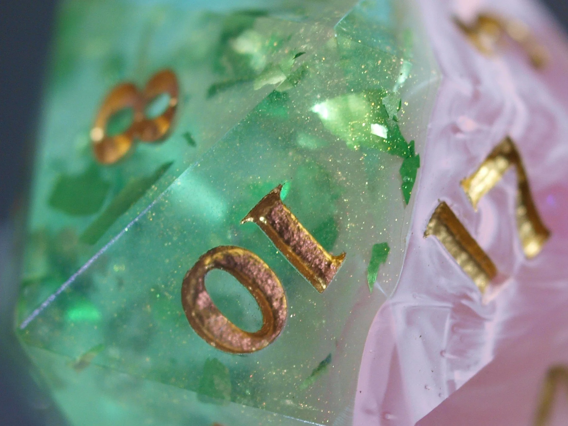 A dice set in a discontinued style, these deeply green and gold dice are a classic any day and will never fade.