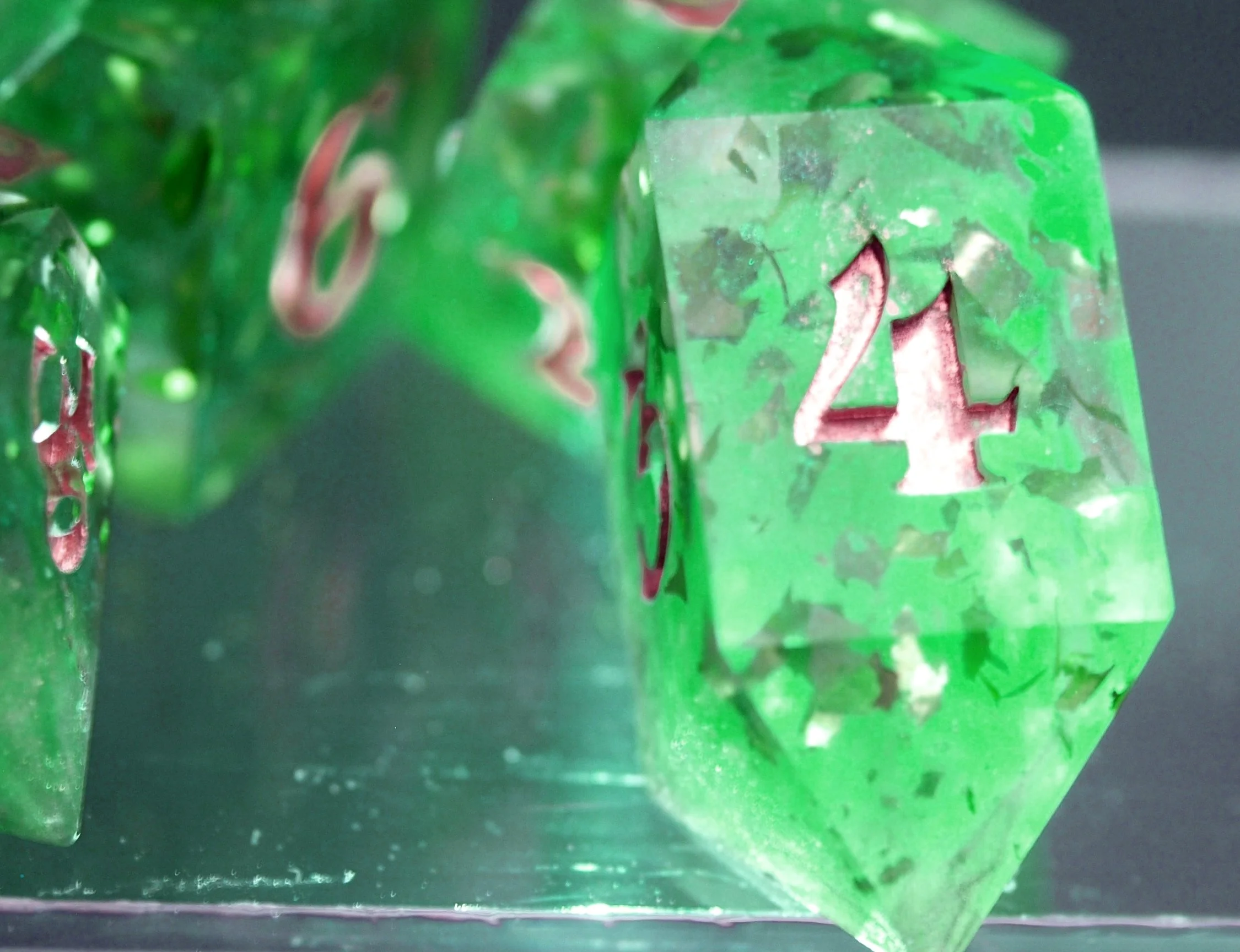 I wanted to make a dice set that looked good in a black light but for a theme it was either this or Cosmic Bowling and to be honest I might still do a cosmic bowling set. In the meantime, enjoy this gnarly wicked cool dice set, my dudes.